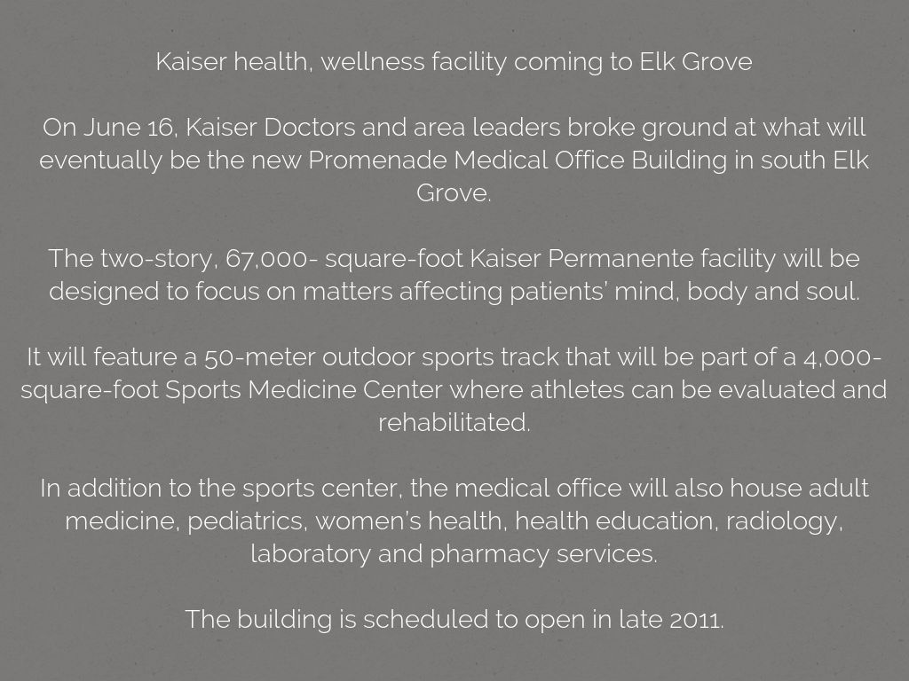 On June 16, Kaiser Doctors and area leaders broke ground at what will eventually be the new Promenade Medical Office Building in south Elk Grove.