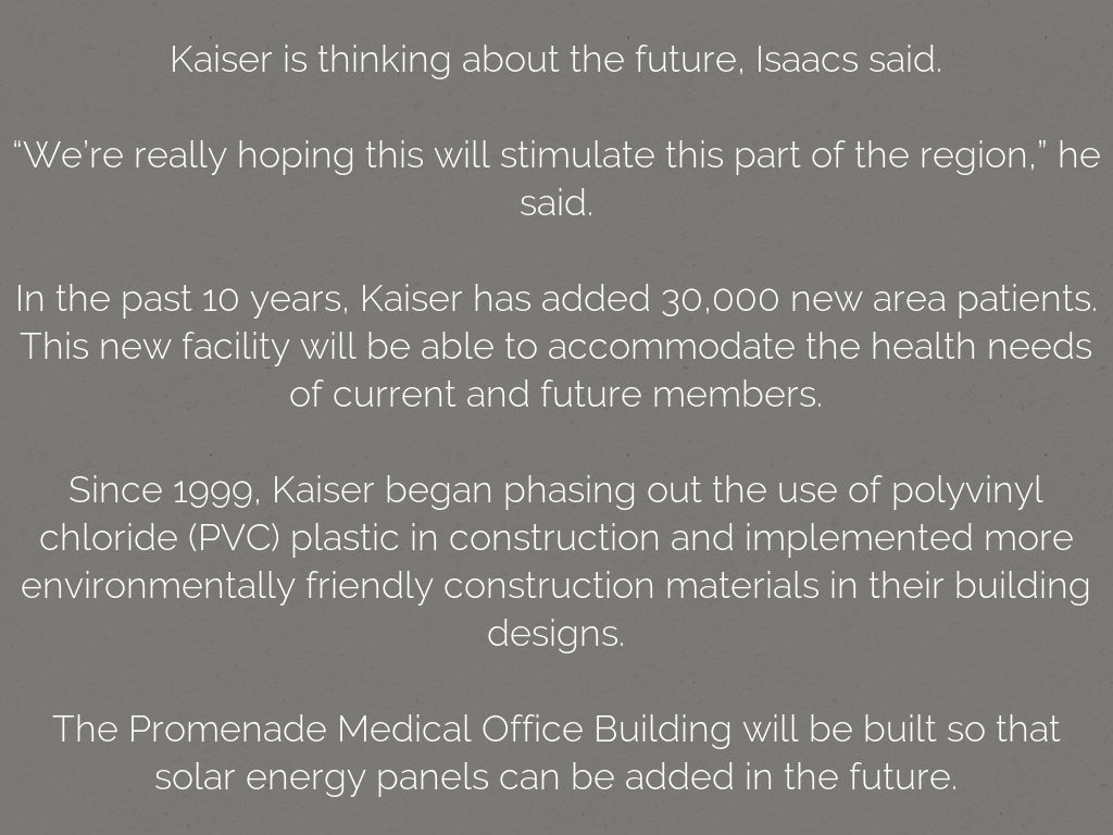 In the past 10 years, Kaiser has added 30,000 new area patients. This new facility will be able to accommodate the health needs of current and future members.