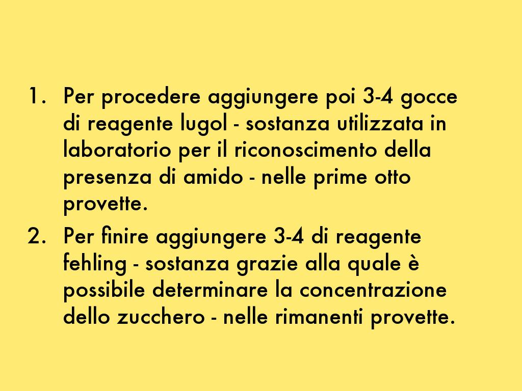 - Per procedere aggiungere poi 3-4 gocce di reagente lugol - sostanza utilizzata in laboratorio per il riconoscimento della presenza di amido - nelle prime otto provette.