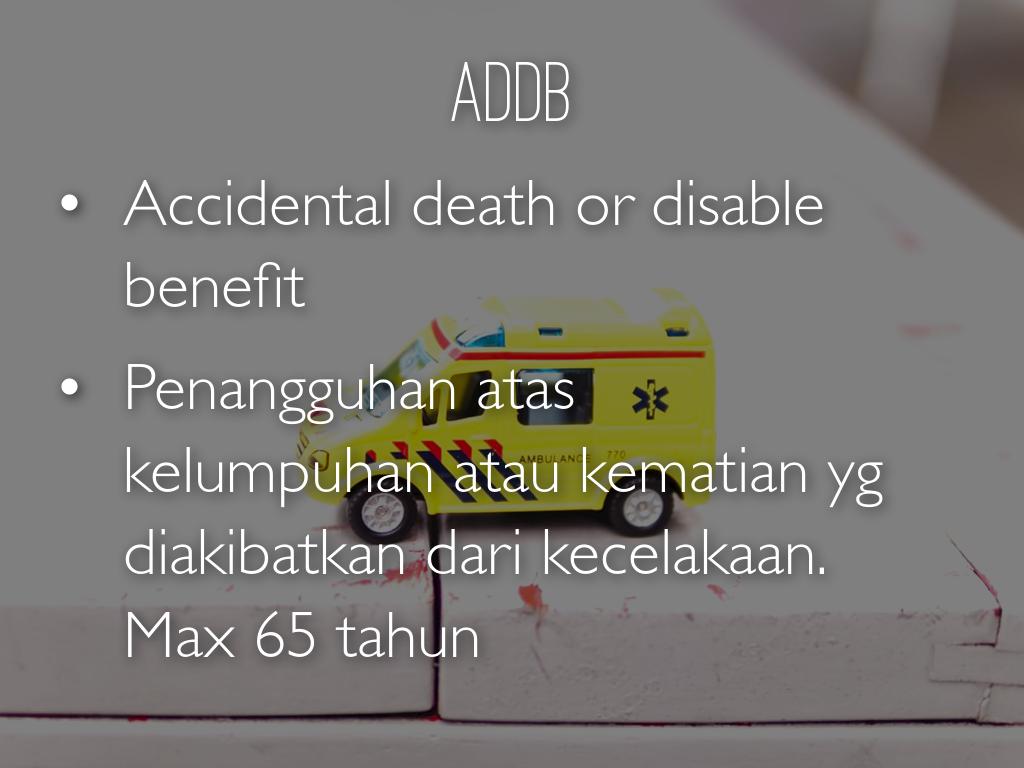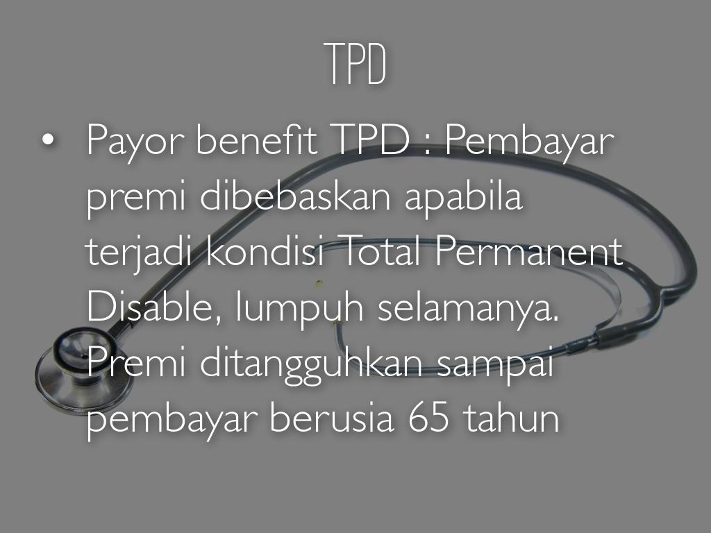 Payor benefit TPD : Pembayar premi dibebaskan apabila terjadi kondisi Total Permanent Disable, lumpuh selamanya. Premi ditangguhkan sampai pembayar berusia 65 tahun
