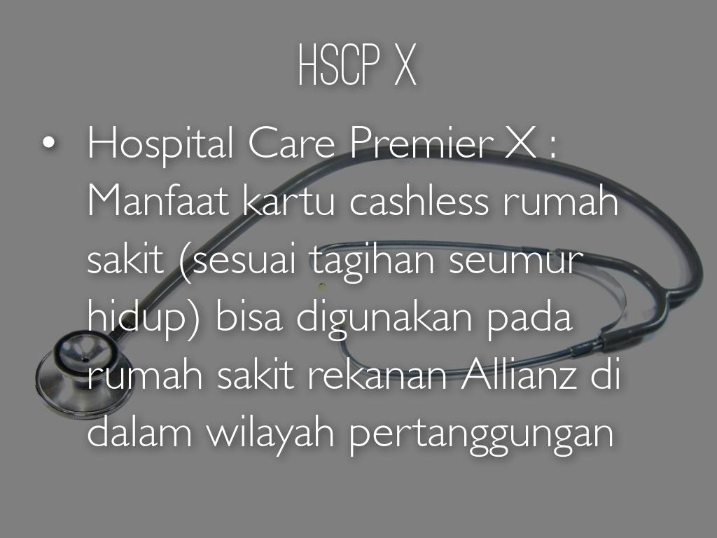 Hospital Care Premier X : Manfaat kartu cashless rumah sakit (sesuai tagihan seumur hidup) bisa digunakan pada rumah sakit rekanan Allianz di dalam wilayah pertanggungan