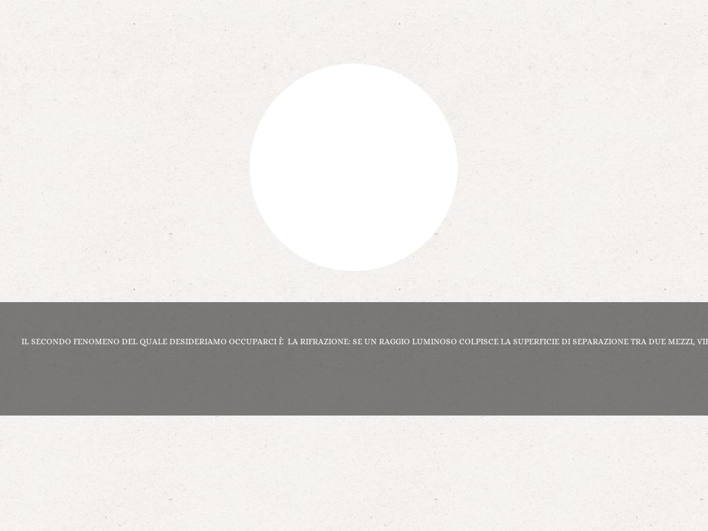 Il secondo fenomeno del quale desideriamo occuparci è la Rifrazione: se un raggio luminoso colpisce la superficie di separazione tra due mezzi, viene deviato. La deviazione che esso subisce dipende dalla natura dei mezzi: se il secondo mezzo è più denso del primo il raggio rifratto si avvicina alla normale, se è meno denso del primo il raggio si allontana.