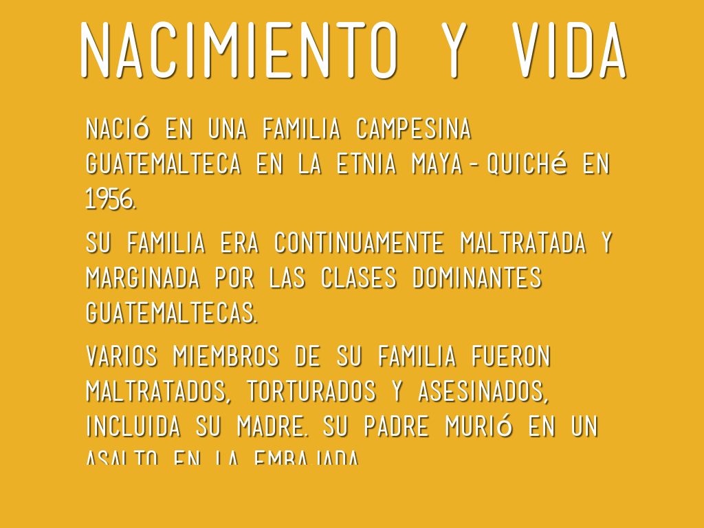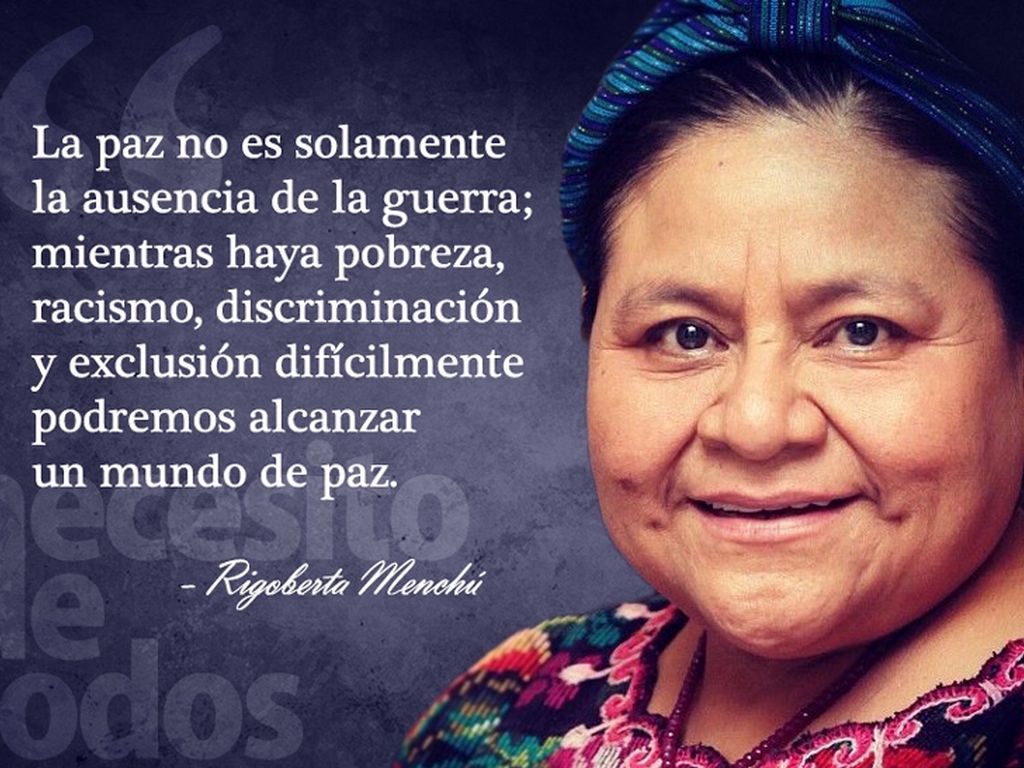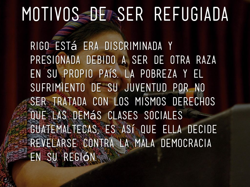 Rigo está era discriminada y presionada debido a ser de otra raza en su propio país. La pobreza y el sufrimiento de su juventud por no ser tratada con los mismos derechos que las demás clases sociales guatemaltecas, es así que ella decide revelarse contra la mala democracia en su región.