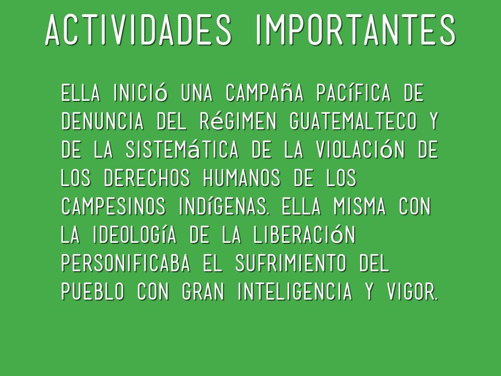 Ella inició una campaña pacífica de denuncia del régimen guatemalteco y de la sistemática de la violación de los derechos humanos de los campesinos indígenas. Ella misma con la ideología de la liberación personificaba el sufrimiento del pueblo con gran inteligencia y vigor.