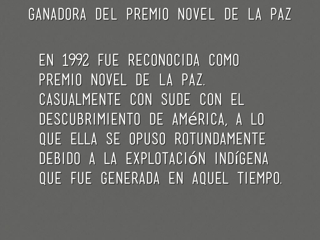 En 1992 fue reconocida como premio novel de La Paz. Casualmente con sude con el descubrimiento de América, a lo que ella se opuso rotundamente debido a la explotación indígena que fue generada en aquel tiempo.