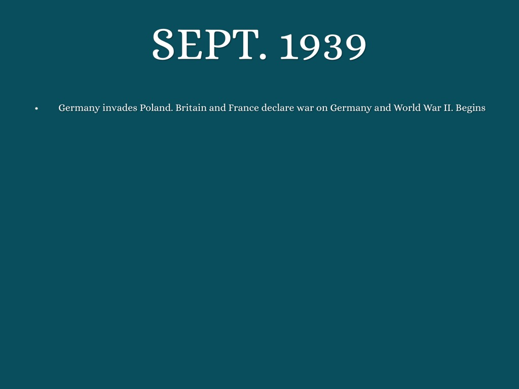 Germany invades Poland. Britain and France declare war on Germany and World War II. Begins