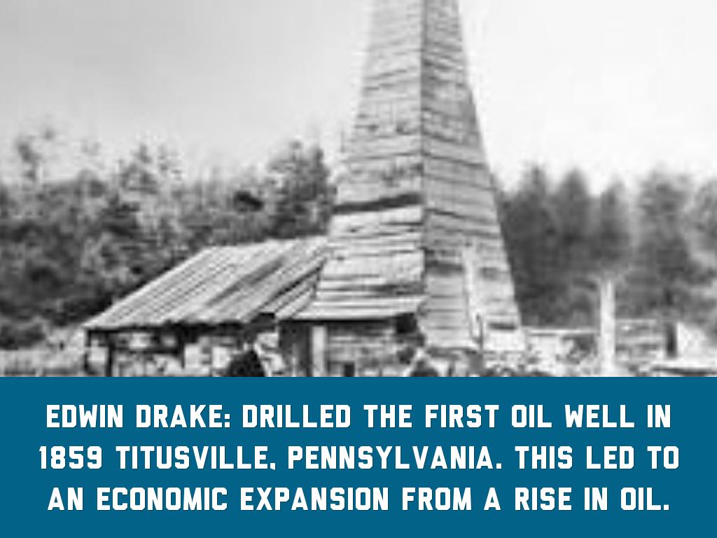 EDWin DRake: Drilled the first oil well in 1859 Titusville, Pennsylvania. This led to an economic expansion from a rise in oil.