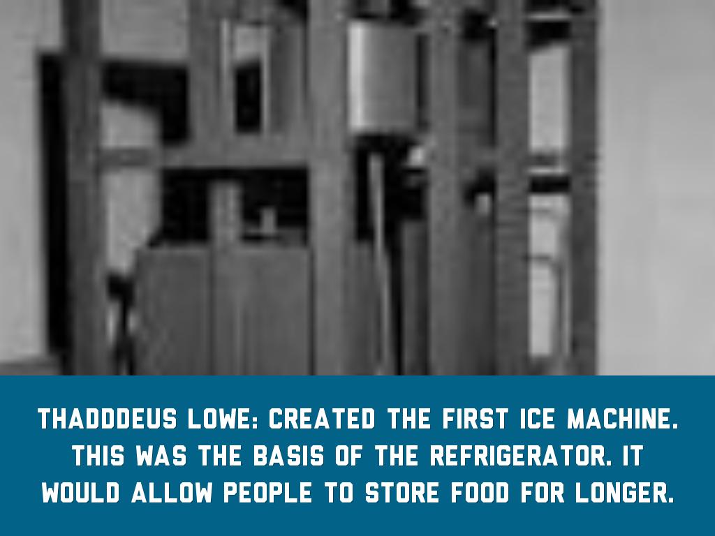Thadddeus Lowe: created the first ice machine. this was the basis of the refrigerator. it would allow people to store food for longer.