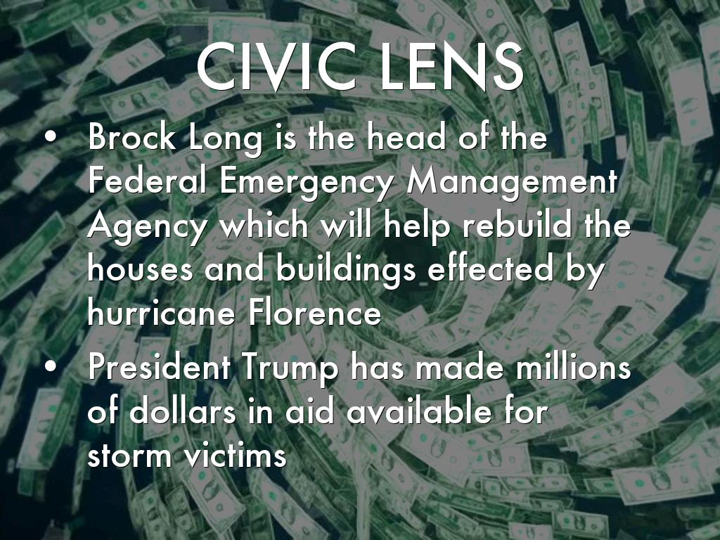 Brock Long is the head of the Federal Emergency Management Agency which will help rebuild the houses and buildings effected by hurricane Florence