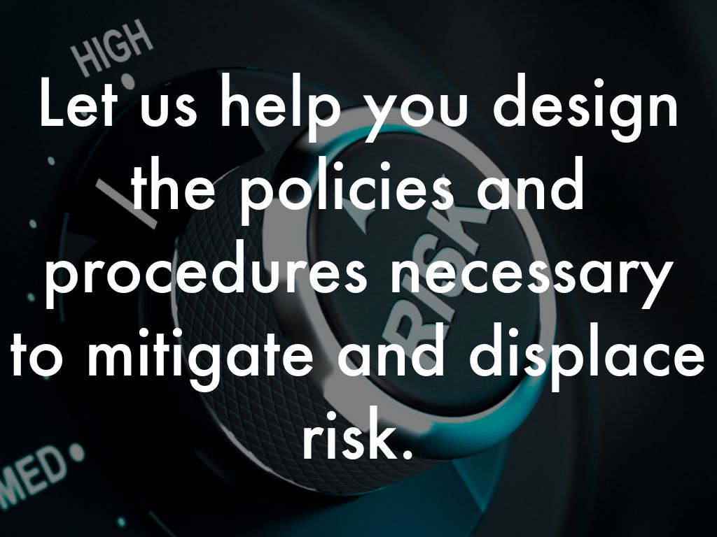 Let us help you design the policies and procedures necessary to mitigate and displace risk.