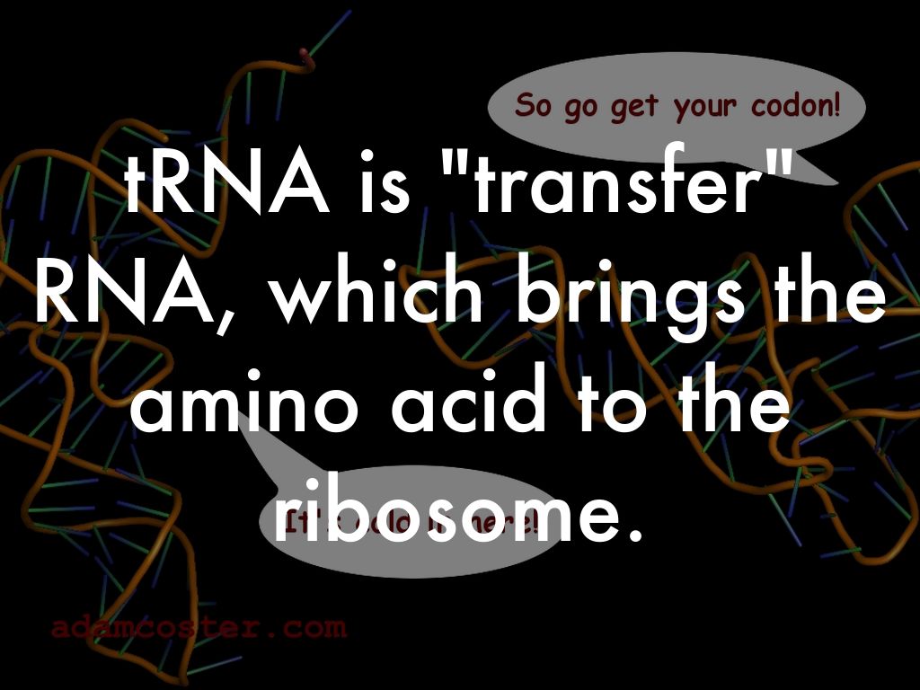 tRNA is "transfer" RNA, which brings the amino acid to the ribosome.