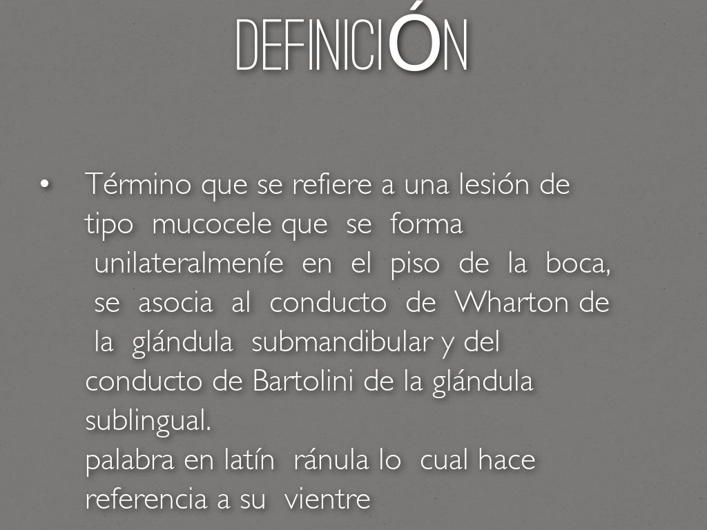 Término que se refiere a una lesión de tipo mucocele que se forma unilateralmeníe en el piso de la boca, se asocia al conducto de Wharton de la glándula submandibular y del conducto de Bartolini de la glándula sublingual.