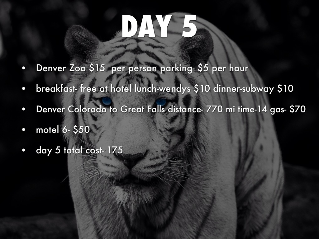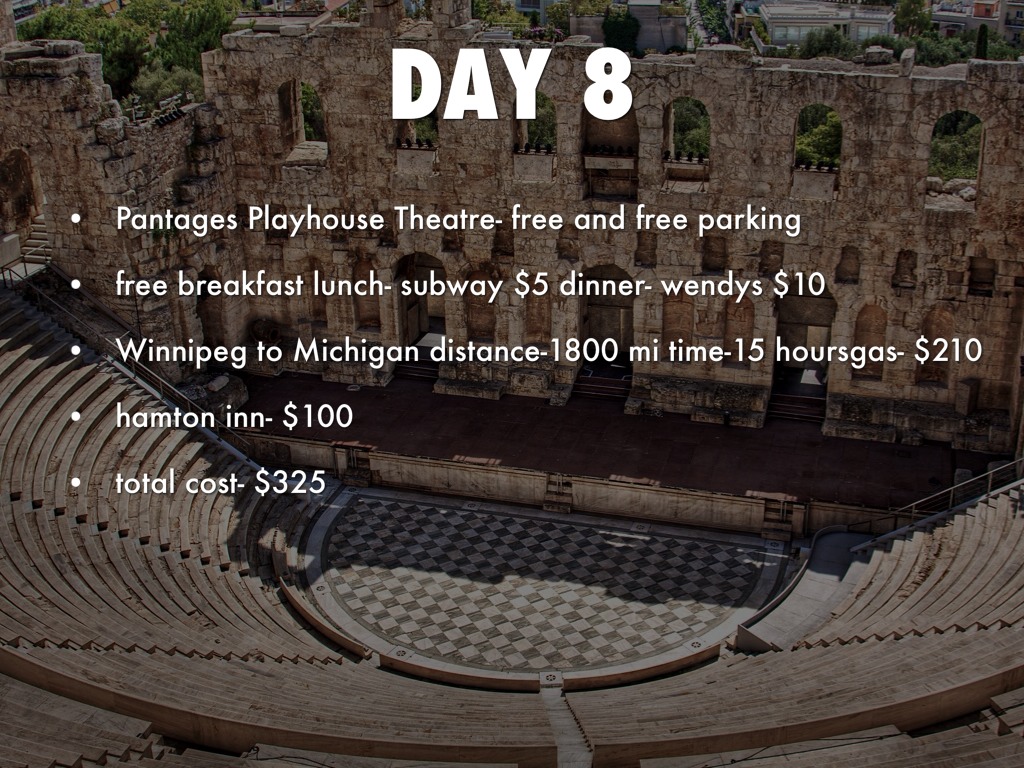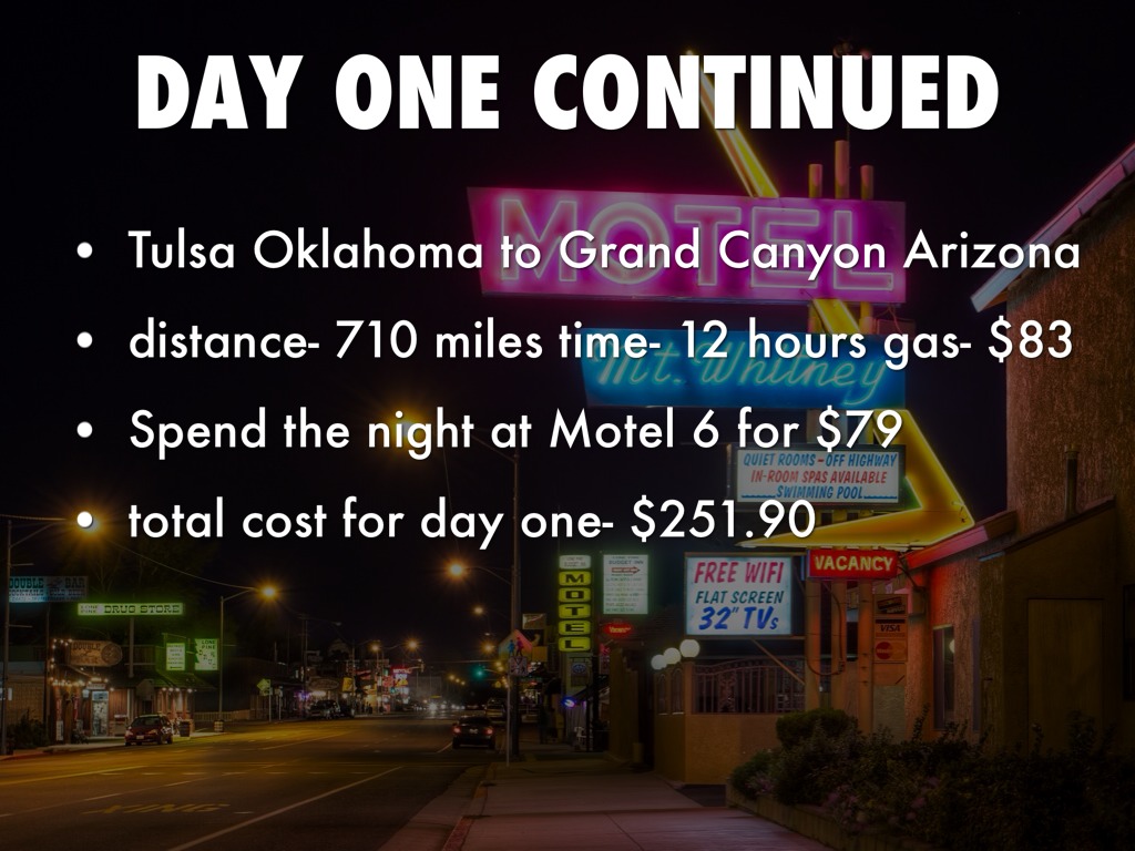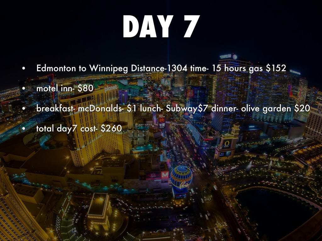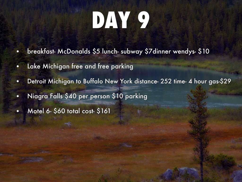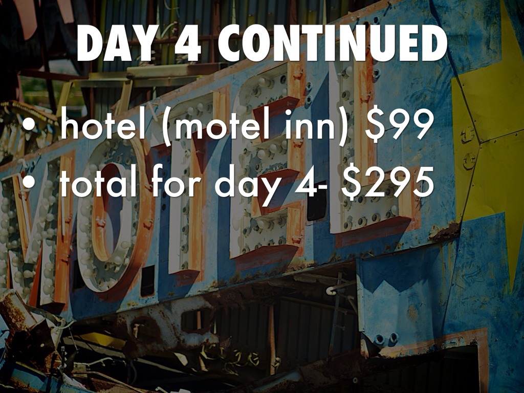 • breakfast- McDonalds $5 lunch- $8.75 Subway dinner- $30 stay at motel 6- $60