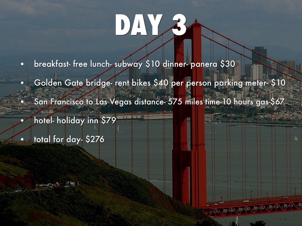 • Golden Gate bridge- rent bikes $40 per person parking meter- $10