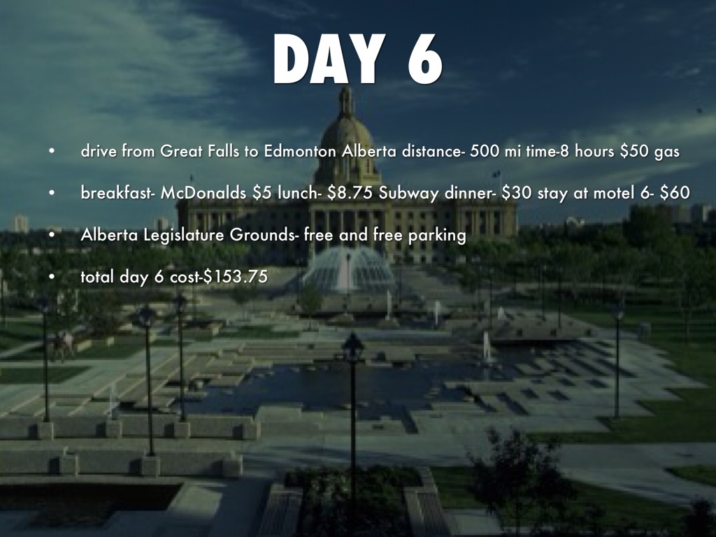 • drive from Great Falls to Edmonton Alberta distance- 500 mi time-8 hours $50 gas
