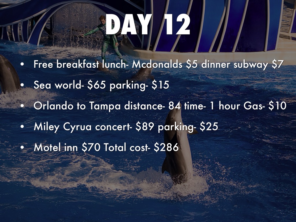 • breakfast- mcDonalds- $1 lunch- Subway$7 dinner- olive garden $20
