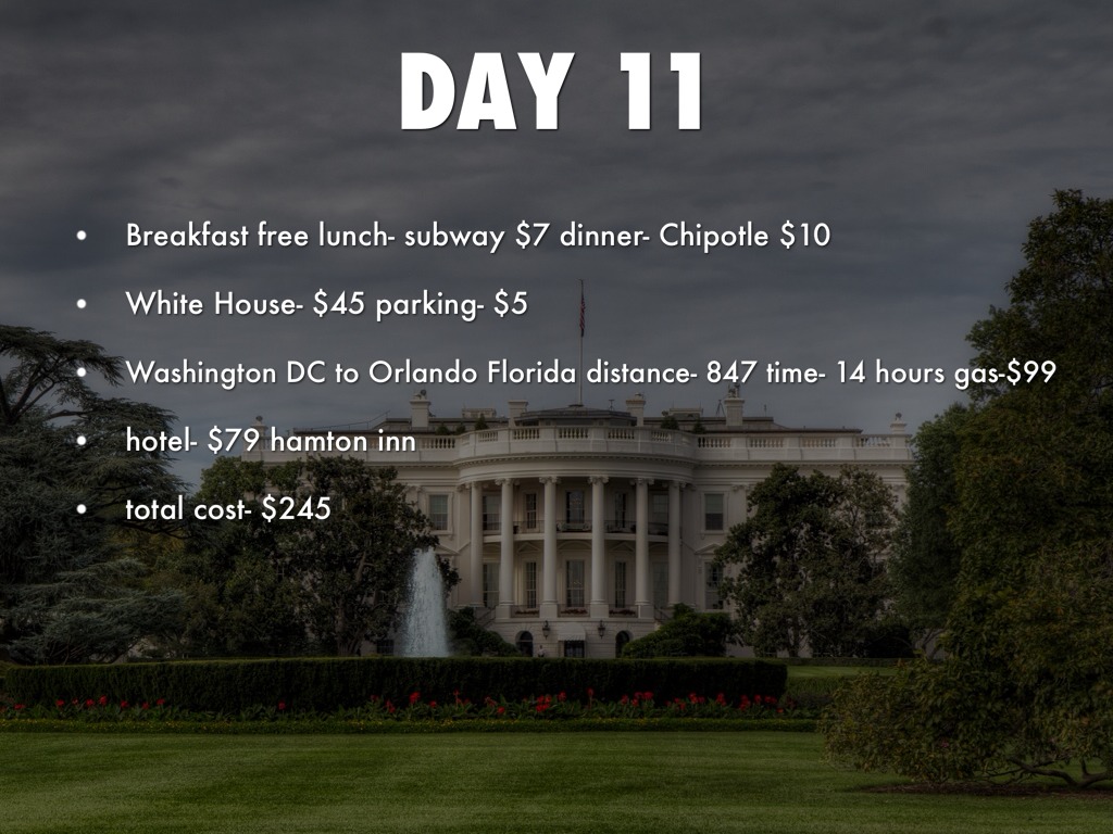 • Washington DC to Orlando Florida distance- 847 time- 14 hours gas-$99