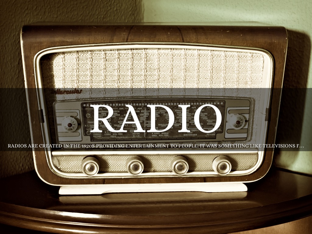 RADIOS ARE CREATED IN THE 1920S PROVIDING ENTERTAINMENT TO PEOPLE. IT WAS SOMETHING LIKE TELEVISIONS FOR US NOW.