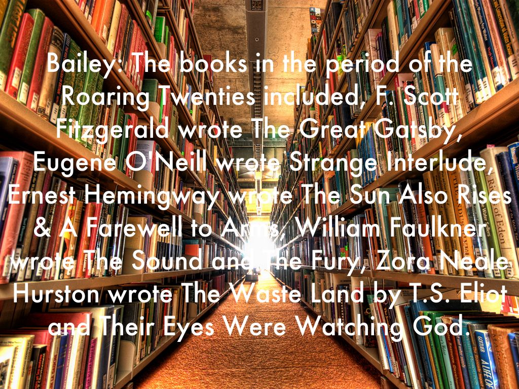 Bailey: The books in the period of the Roaring Twenties included, F. Scott Fitzgerald wrote The Great Gatsby, Eugene O'Neill wrote Strange Interlude, Ernest Hemingway wrote The Sun Also Rises & A Farewell to Arms, William Faulkner wrote The Sound and The Fury, Zora Neale Hurston wrote The Waste Land by T.S. Eliot and Their Eyes Were Watching God.