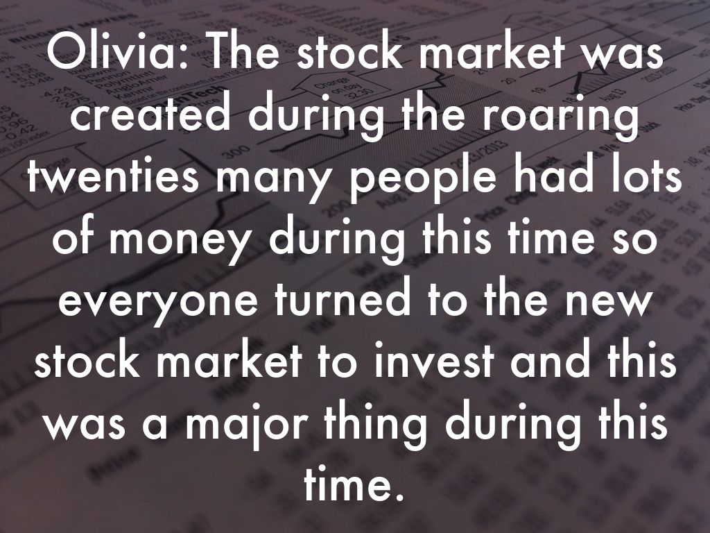 Olivia: The stock market was created during the roaring twenties many people had lots of money during this time so everyone turned to the new stock market to invest and this was a major thing during this time.