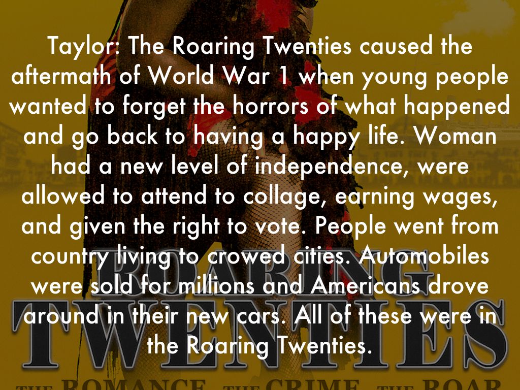 Taylor: The Roaring Twenties caused the aftermath of World War 1 when young people wanted to forget the horrors of what happened and go back to having a happy life. Woman had a new level of independence, were allowed to attend to collage, earning wages, and given the right to vote. People went from country living to crowed cities. Automobiles were sold for millions and Americans drove around in their new cars. All of these were in the Roaring Twenties.