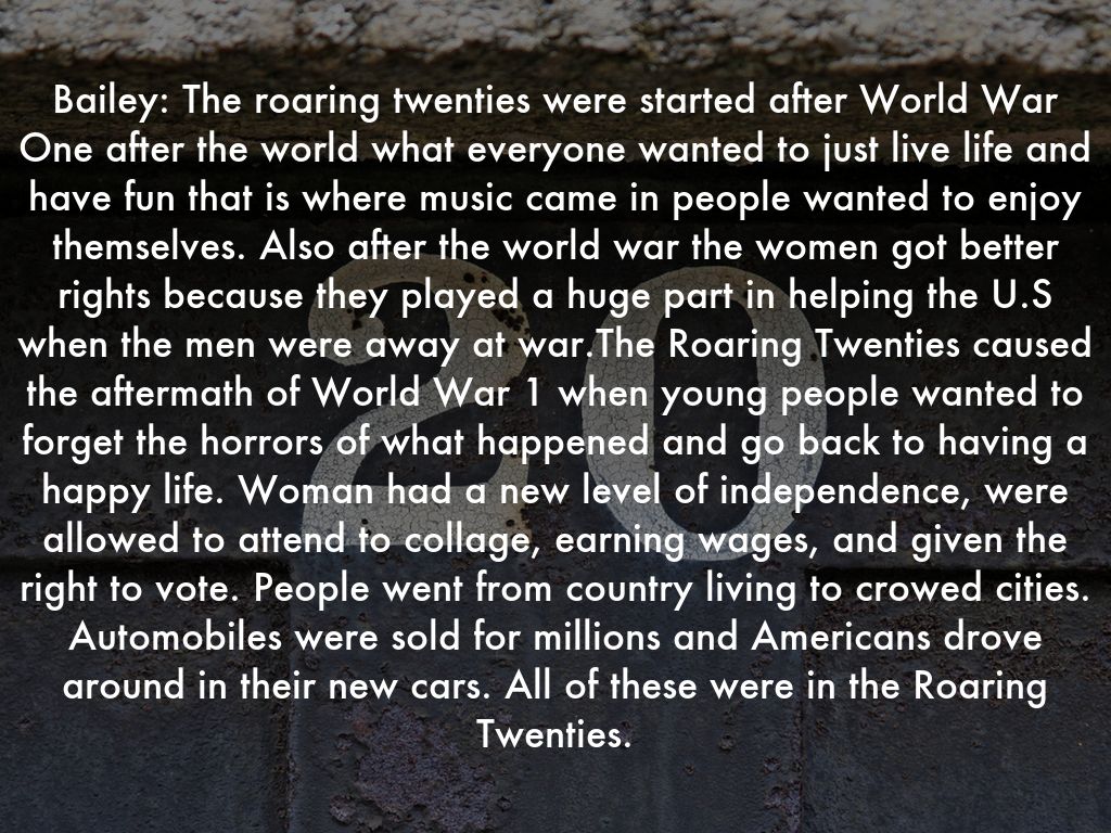 Bailey: The roaring twenties were started after World War One after the world what everyone wanted to just live life and have fun that is where music came in people wanted to enjoy themselves. Also after the world war the women got better rights because they played a huge part in helping the U.S when the men were away at war.The Roaring Twenties caused the aftermath of World War 1 when young people wanted to forget the horrors of what happened and go back to having a happy life. Woman had a new level of independence, were allowed to attend to collage, earning wages, and given the right to vote. People went from country living to crowed cities. Automobiles were sold for millions and Americans drove around in their new cars. All of these were in the Roaring Twenties.