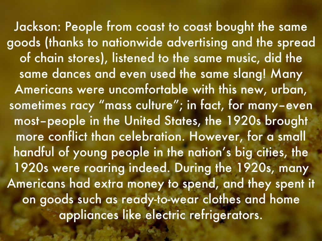 Jackson: People from coast to coast bought the same goods (thanks to nationwide advertising and the spread of chain stores), listened to the same music, did the same dances and even used the same slang! Many Americans were uncomfortable with this new, urban, sometimes racy “mass culture”; in fact, for many–even most–people in the United States, the 1920s brought more conflict than celebration. However, for a small handful of young people in the nation’s big cities, the 1920s were roaring indeed. During the 1920s, many Americans had extra money to spend, and they spent it on goods such as ready-to-wear clothes and home appliances like electric refrigerators.