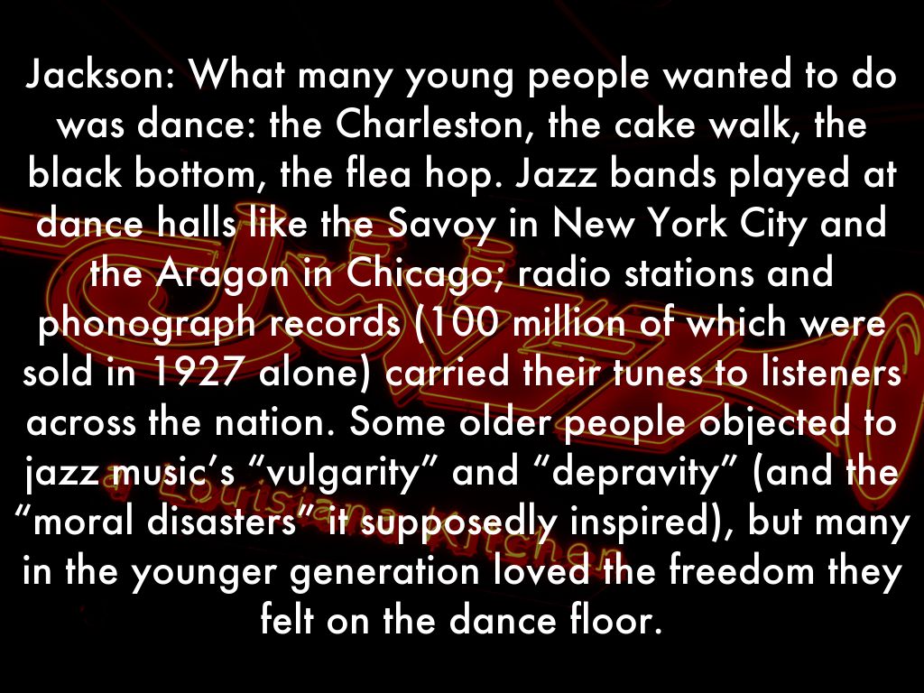 Jackson: What many young people wanted to do was dance: the Charleston, the cake walk, the black bottom, the flea hop. Jazz bands played at dance halls like the Savoy in New York City and the Aragon in Chicago; radio stations and phonograph records (100 million of which were sold in 1927 alone) carried their tunes to listeners across the nation. Some older people objected to jazz music’s “vulgarity” and “depravity” (and the “moral disasters” it supposedly inspired), but many in the younger generation loved the freedom they felt on the dance floor.