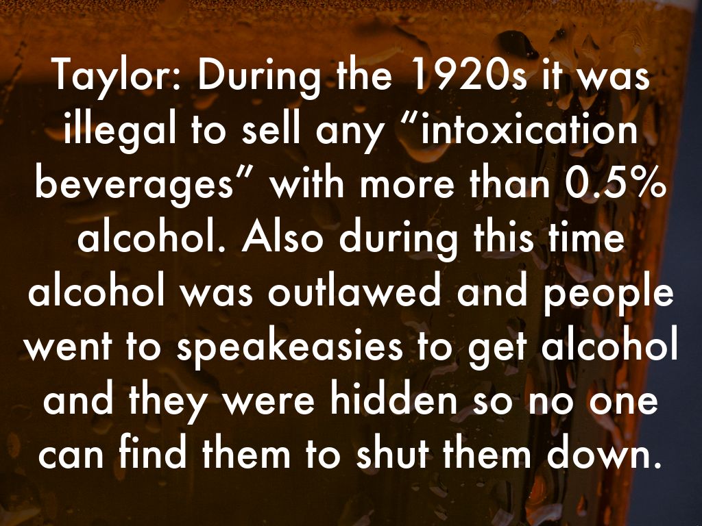 Taylor: During the 1920s it was illegal to sell any “intoxication beverages” with more than 0.5% alcohol. Also during this time alcohol was outlawed and people went to speakeasies to get alcohol and they were hidden so no one can find them to shut them down.