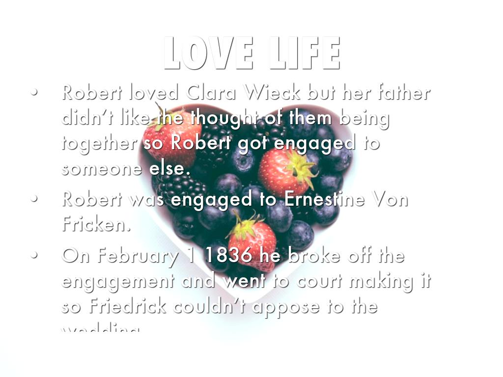 Robert loved Clara Wieck but her father didn’t like the thought of them being together so Robert got engaged to someone else.