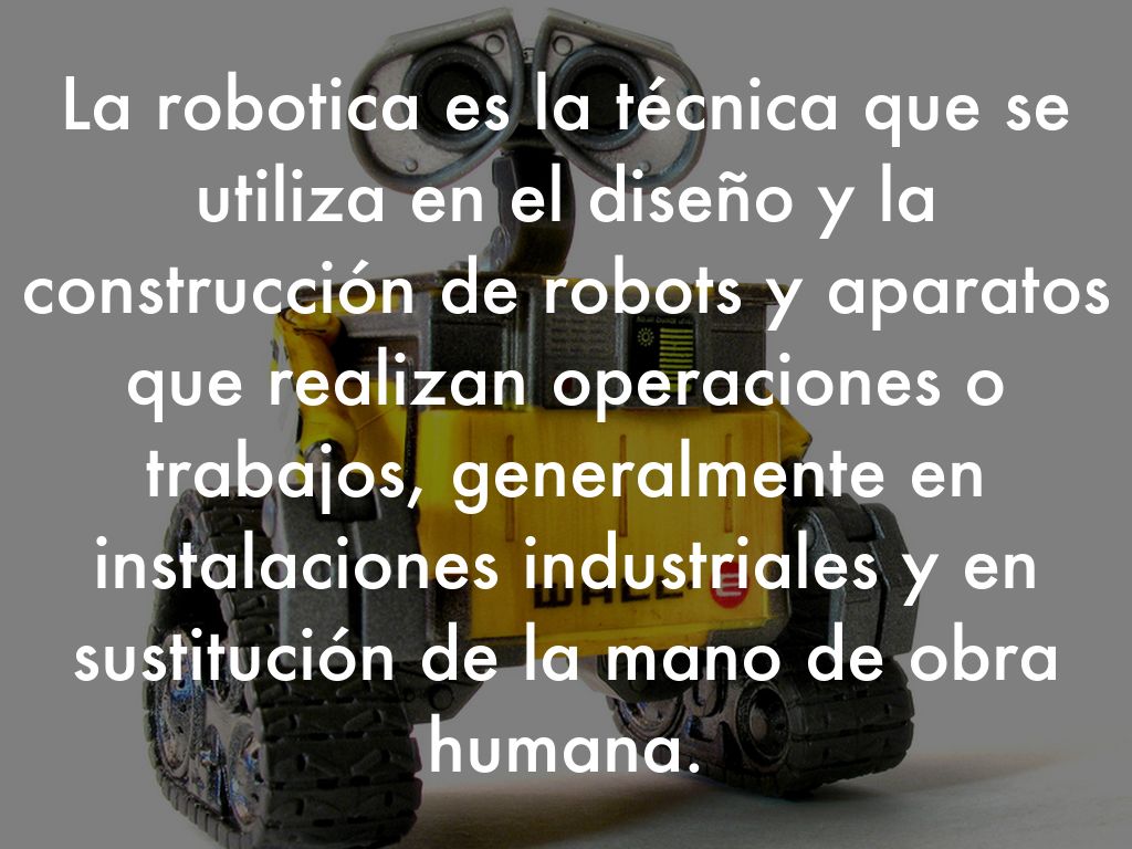La robotica es la técnica que se utiliza en el diseño y la construcción de robots y aparatos que realizan operaciones o trabajos, generalmente en instalaciones industriales y en sustitución de la mano de obra humana.