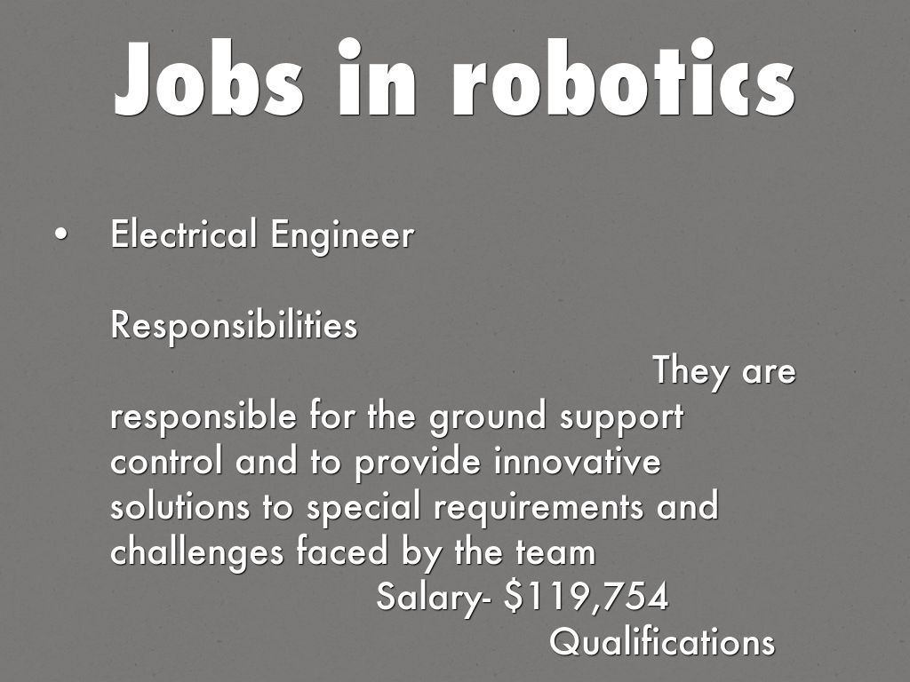 • Electrical Engineer Responsibilities They are responsible for the ground support control and to provide innovative solutions to special requirements and challenges faced by the team Salary- $119,754 Qualifications Undergraduate degree in an engineering related discipline is required At least 1 year of experience with instrumentation power systems design. Understanding of basic low power systems and basic DC circuits and filters. Experience with a data acquisition system and instrumentation of some type.