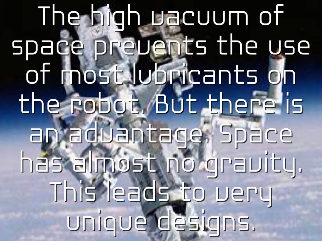 The high vacuum of space prevents the use of most lubricants on the robot. But there is an advantage. Space has almost no gravity. This leads to very unique designs.