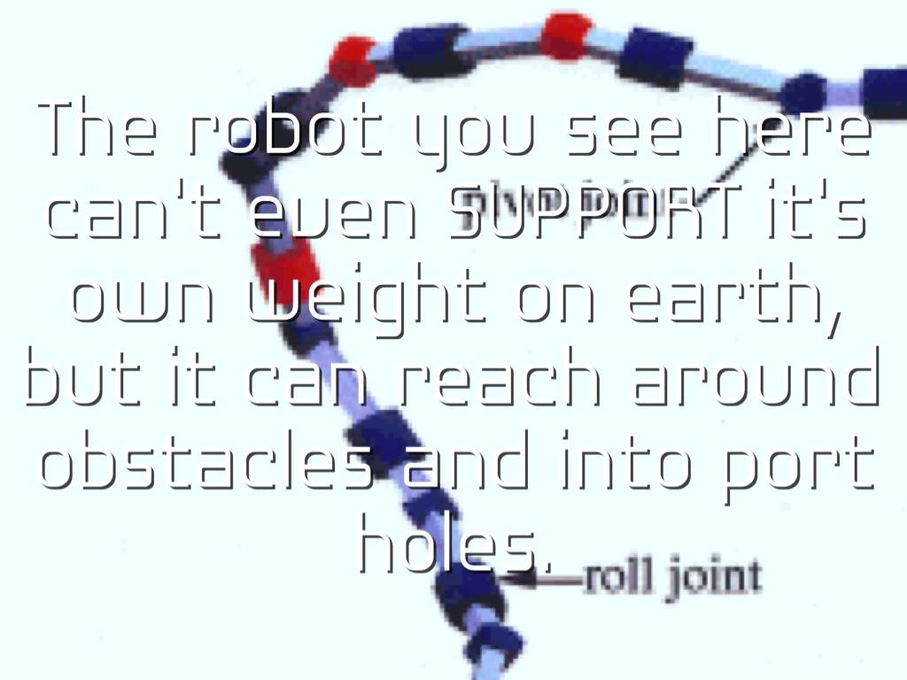 The robot you see here can't even SUPPORT it's own weight on earth, but it can reach around obstacles and into port holes.
