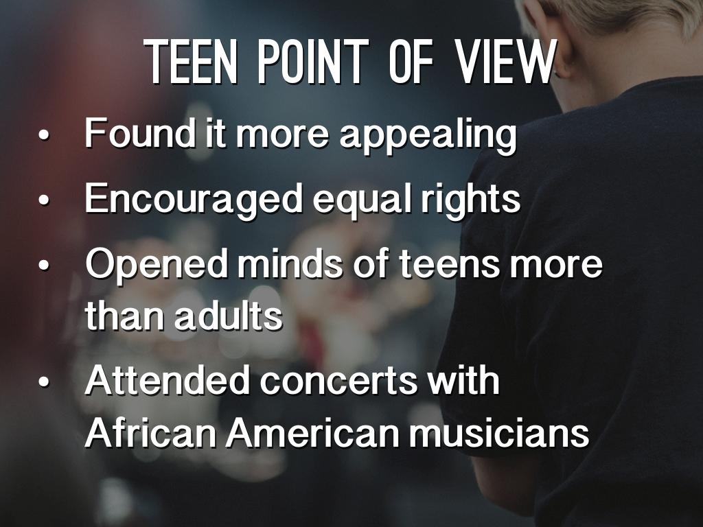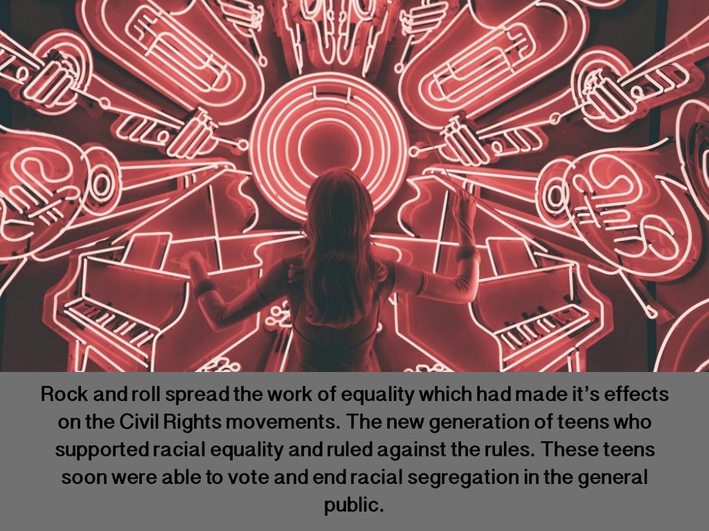 Rock and roll spread the work of equality which had made it’s effects on the Civil Rights movements. The new generation of teens who supported racial equality and ruled against the rules. These teens soon were able to vote and end racial segregation in the general public.