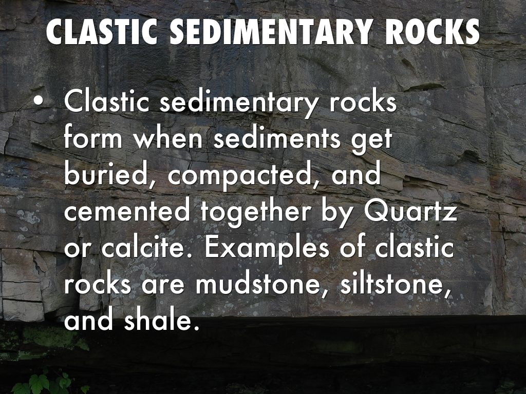Clastic sedimentary rocks form when sediments get buried, compacted, and cemented together by Quartz or calcite. Examples of clastic rocks are mudstone, siltstone, and shale.