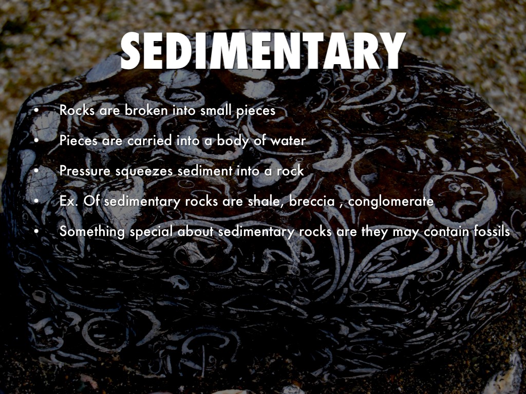 Ex. Of sedimentary rocks are shale, breccia , conglomerate