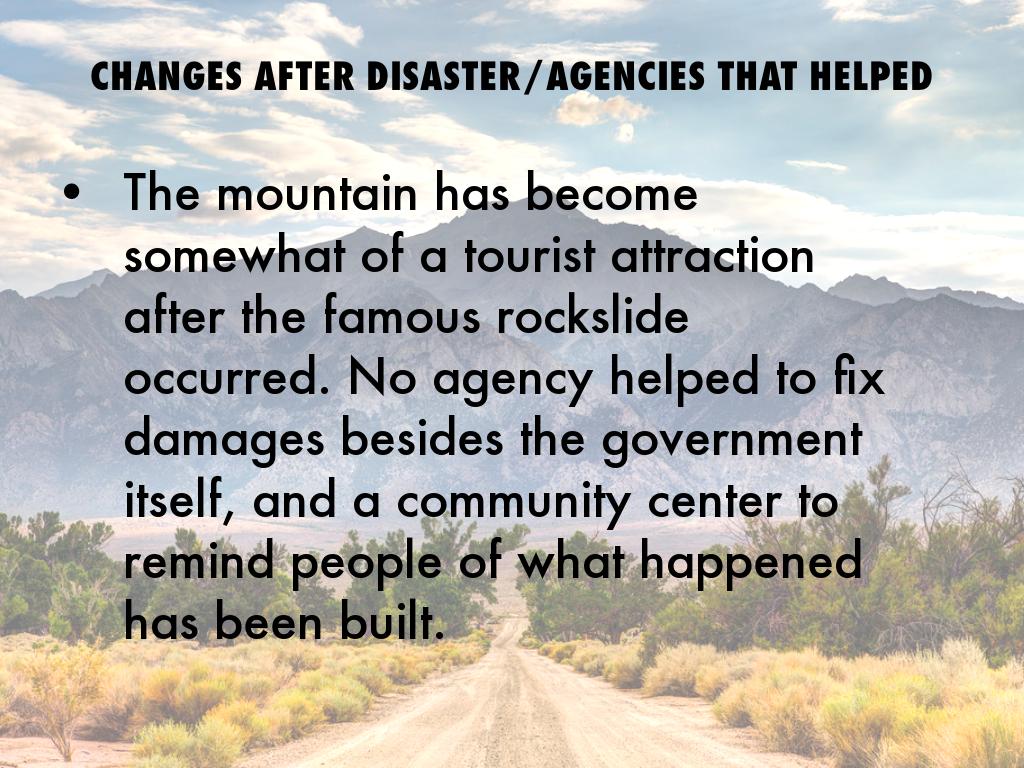 The mountain has become somewhat of a tourist attraction after the famous rockslide occurred. No agency helped to fix damages besides the government itself, and a community center to remind people of what happened has been built.