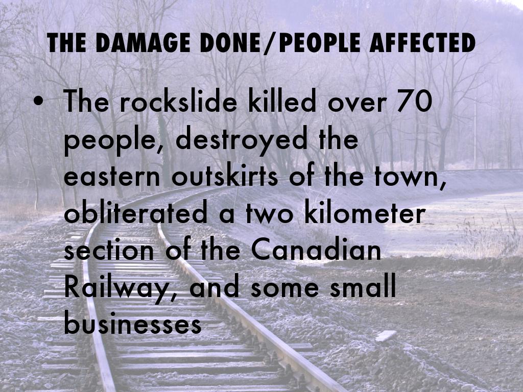 The rockslide killed over 70 people, destroyed the eastern outskirts of the town, obliterated a two kilometer section of the Canadian Railway, and some small businesses
