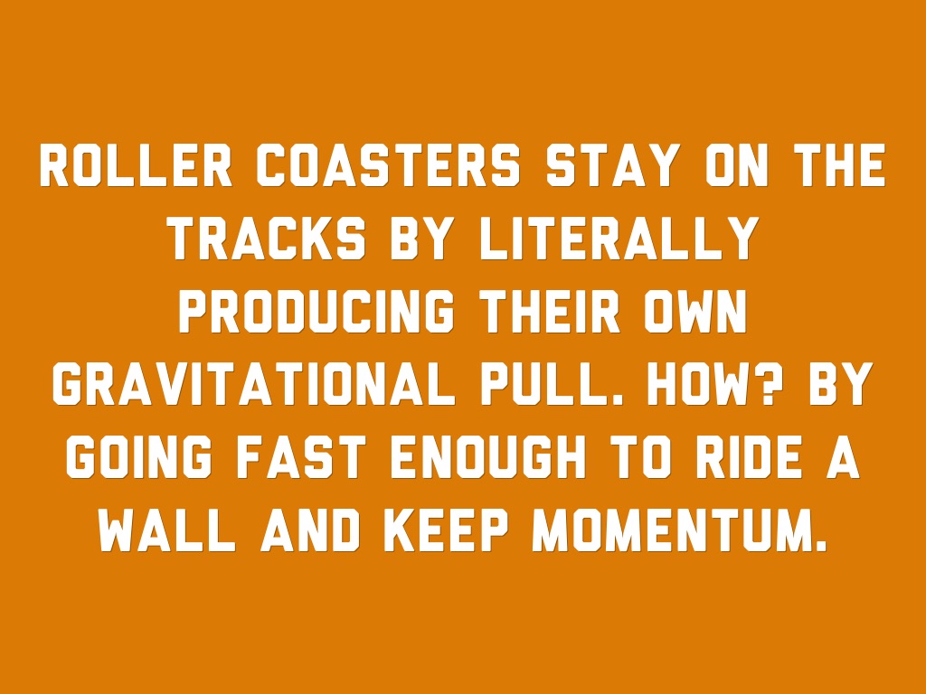 Roller coasters stay on the tracks by literally producing their own gravitational pull. How? By going fast enough to ride a wall and keep momentum.