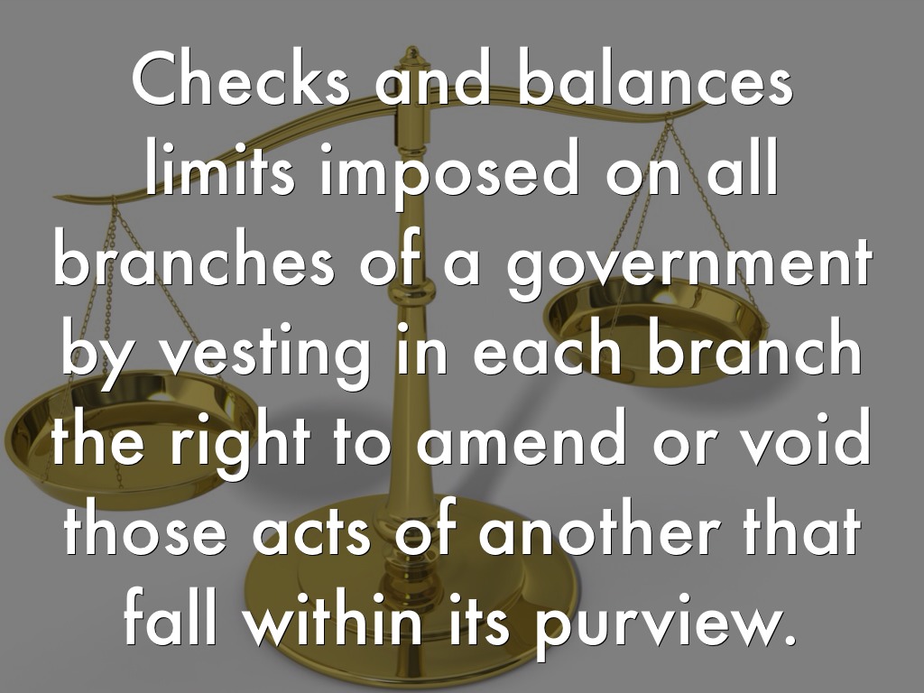 Checks and balances limits imposed on all branches of a government by vesting in each branch the right to amend or void those acts of another that fall within its purview.
