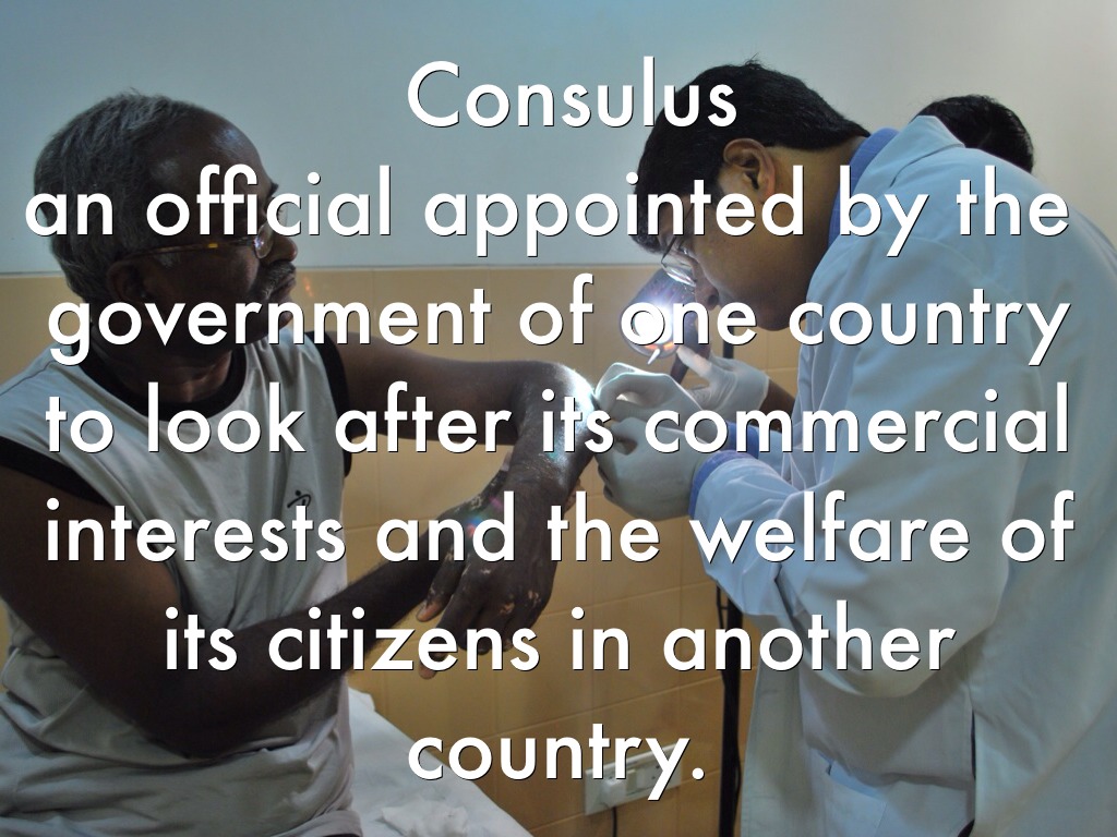 Consulus an official appointed by the government of one country to look after its commercial interests and the welfare of its citizens in another country.