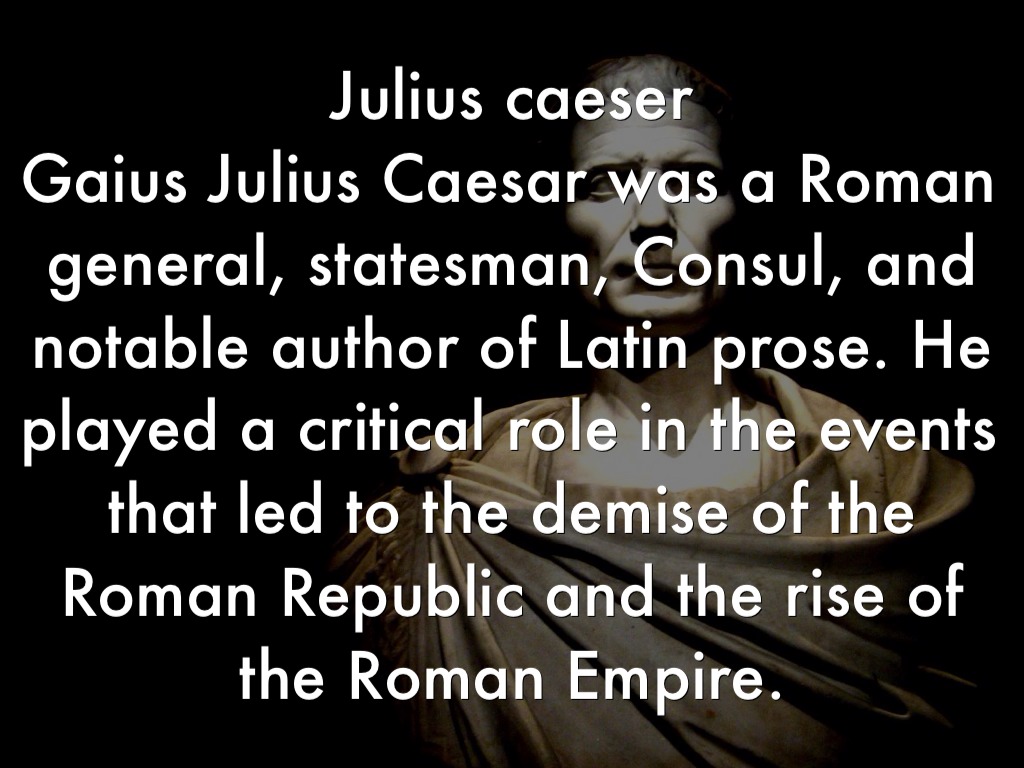 Julius caeser Gaius Julius Caesar was a Roman general, statesman, Consul, and notable author of Latin prose. He played a critical role in the events that led to the demise of the Roman Republic and the rise of the Roman Empire.
