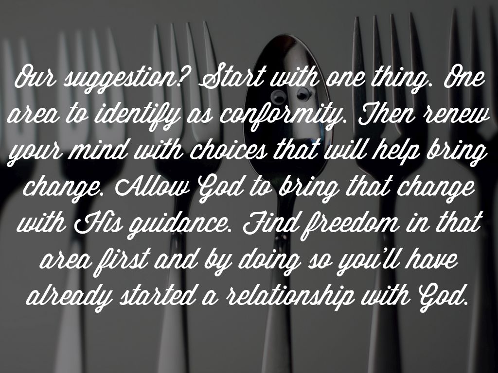 Our suggestion? Start with one thing. One area to identify as conformity. Then renew your mind with choices that will help bring change. Allow God to bring that change with His guidance. Find freedom in that area first and by doing so you'll have already started a relationship with God.