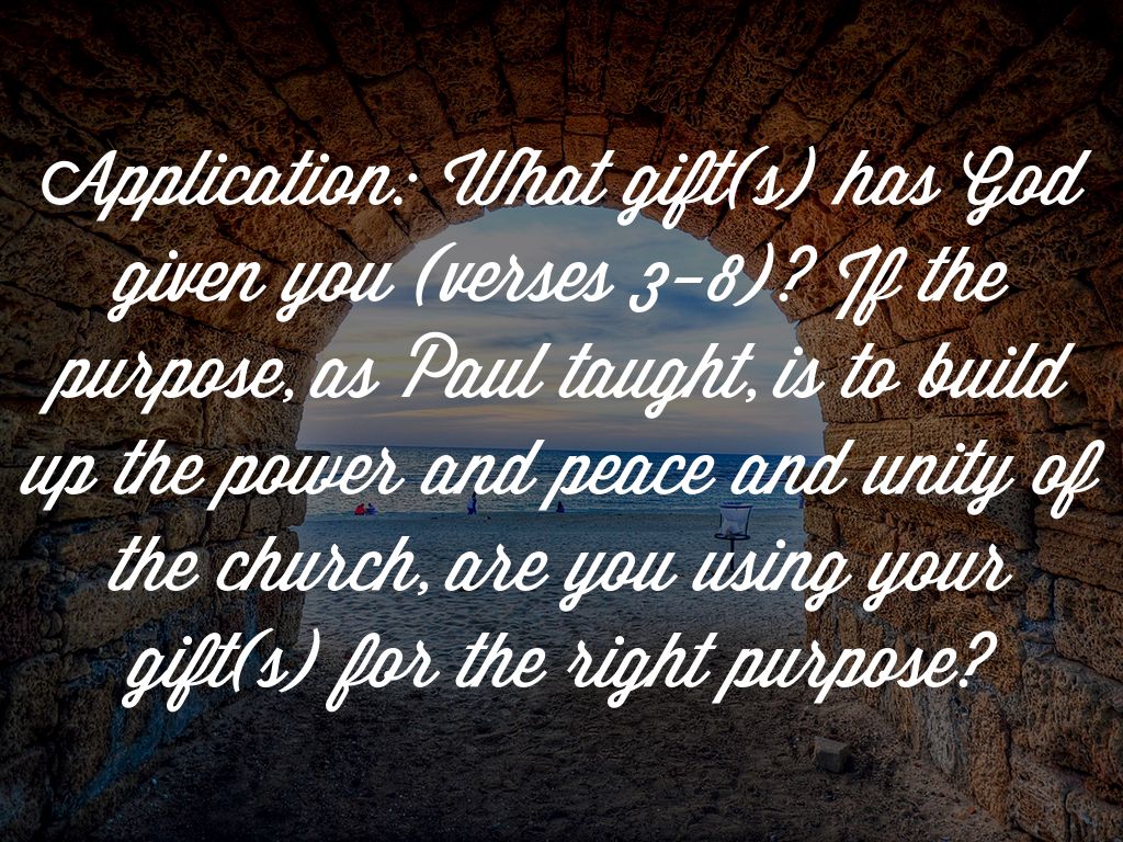 Application: What gift(s) has God given you (verses 3-8)? If the purpose, as Paul taught, is to build up the power and peace and unity of the church, are you using your gift(s) for the right purpose?