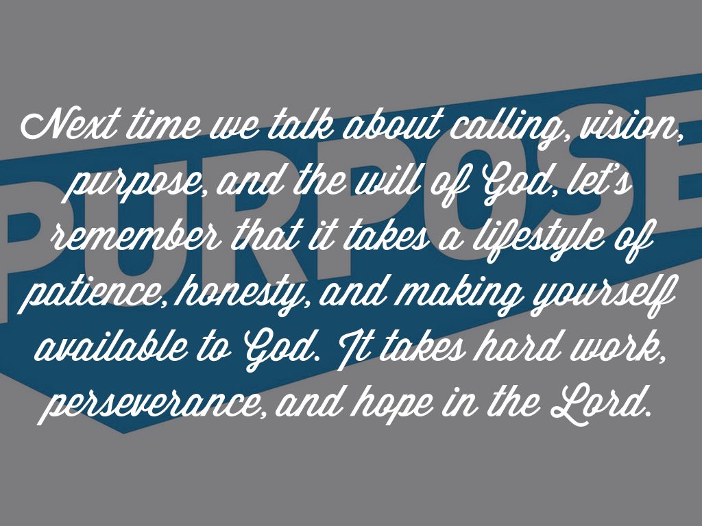 Next time we talk about calling, vision, purpose, and the will of God, let's remember that it takes a lifestyle of patience, honesty, and making yourself available to God. It takes hard work, perseverance, and hope in the Lord.