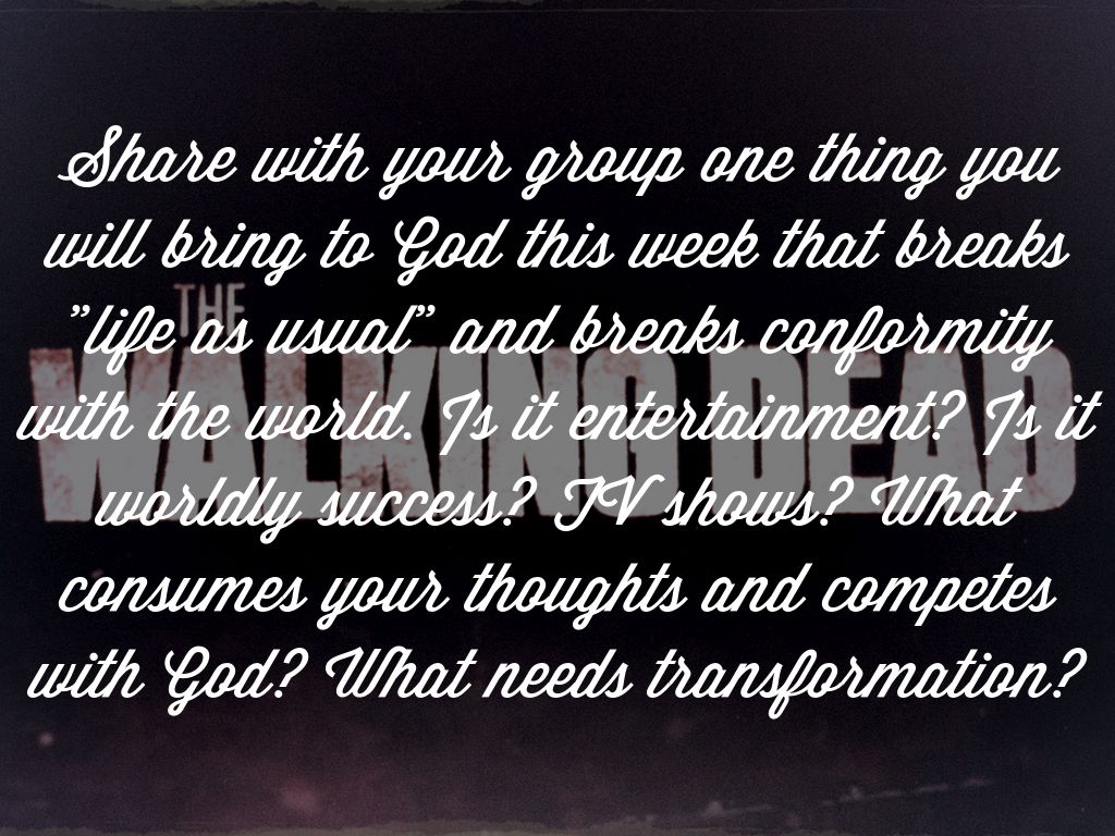 Share with your group one thing you will bring to God this week that breaks "life as usual" and breaks conformity with the world. Is it entertainment? Is it worldly success? TV shows? What consumes your thoughts and competes with God? What needs transformation?