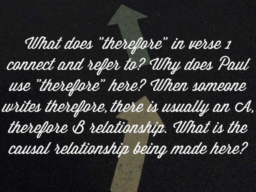 What does "therefore" in verse 1 connect and refer to? Why does Paul use "therefore" here? When someone writes therefore, there is usually an A, therefore B relationship. What is the causal relationship being made here?