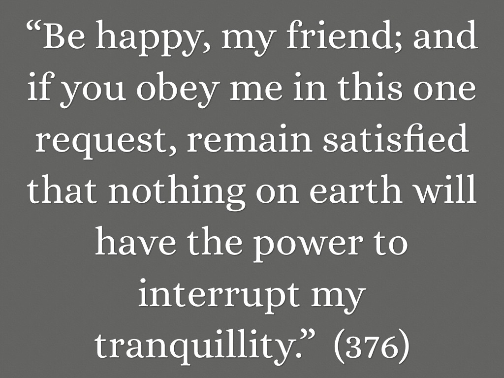 “Be happy, my friend; and if you obey me in this one request, remain satisfied that nothing on earth will have the power to interrupt my tranquillity.” (376)