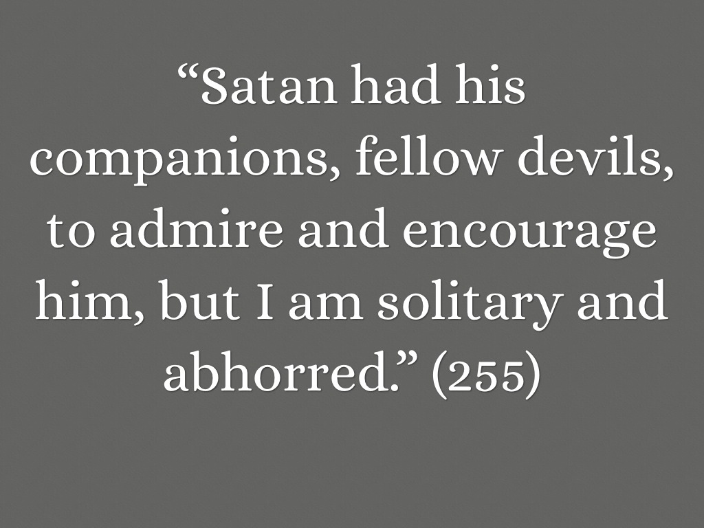 “Satan had his companions, fellow devils, to admire and encourage him, but I am solitary and abhorred.” (255)